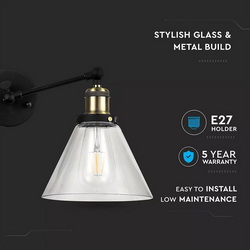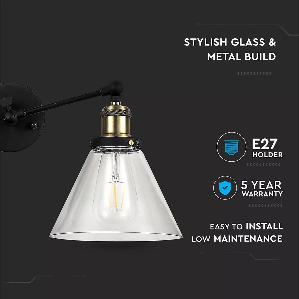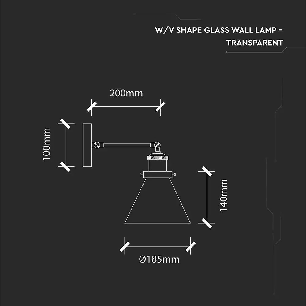 Informatii generale Tip de soclu E27 Date electrice Putere Max. 60W Detalii corp Culoare corp Transparent Tip Lampa de perete Material Sticla, Metal Forma Forma V Capabilitati Rata IP IP20 Compatibilitatea Becuri E27, NU sunt incluse Dimimensiuni Marime 160 x Ø140mm
