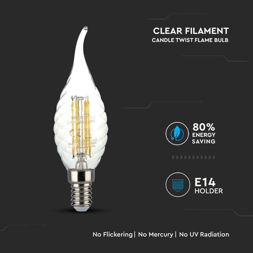 Soclu E14 Forma becului Tip Lumanare cu flacara Tipul Ledului Filament Durata de viata 20.000 ore Putere 4 W Putere echivalenta 40 W Tensiune/Frecventa 220-240V/AC,50Hertz Culoarea luminii Alb Rece Temperatura de ciloare 6000 K Flux luminos 400 Lumeni Unghi 300 grade Material Sticla Culoare Transparent Rata IP IP 20 Dimeniuni 121*37 mm Garantie 2 ani