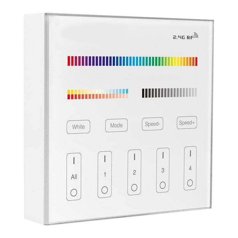 Telecomanda pentru iluminat cu montaj pe perete pentru produsele Wireless 2.4GHz Mi-Light, 4 zone, luminozitate si temperatura culoare ajustabile, rezistenta la zgarieturi si suprafata tactila sensibila, baterii 2xAAA, 2.4GHz RF