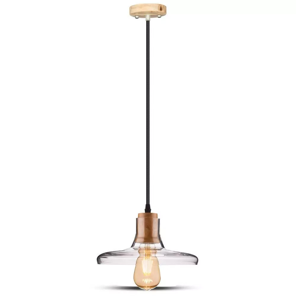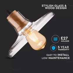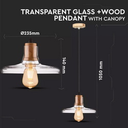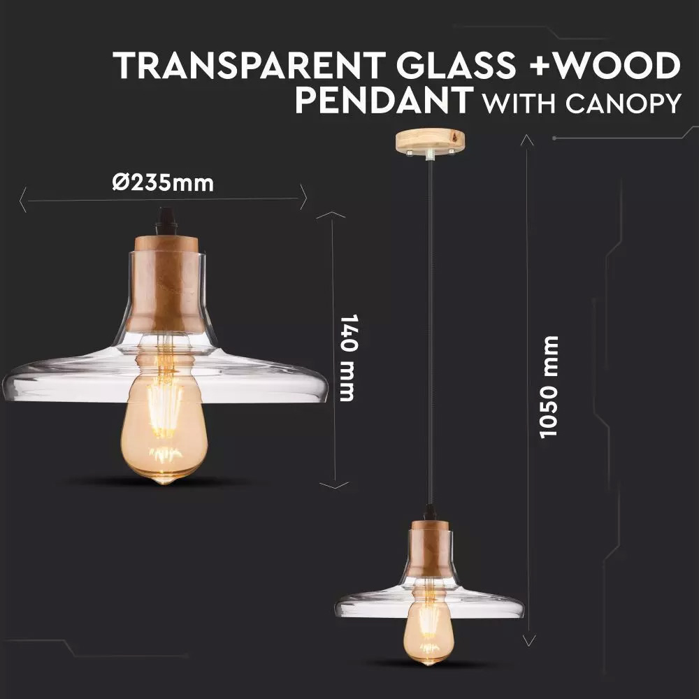 Putere Max 60 W Tensiune 220-240V/AC,50-60Hz Soclu E27 Serie Corp suspendat Forma Bec Compatibil cu A60/67 ST-64 si Seria becurior de tip Glob Dimensiuni 140*235 mm Lungimea cablului 1000 mm Material corp Sticla si Lemn Culoare Transparent Tip Pendul cu suport Compatibilitate Becuri E27, nu sunt incluse