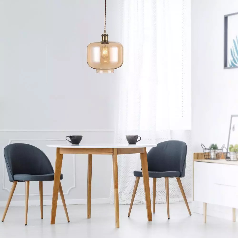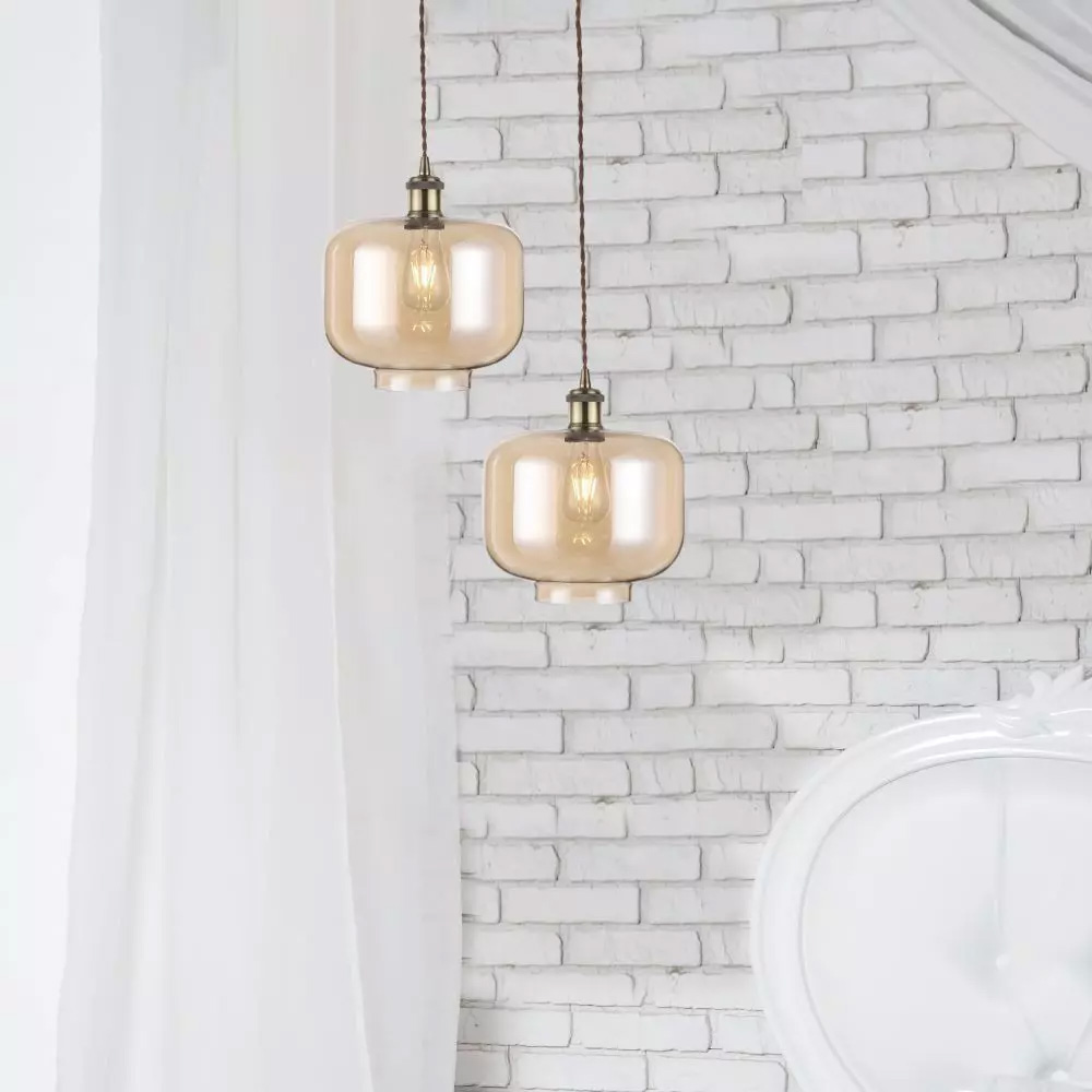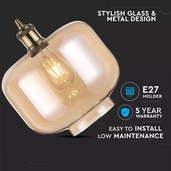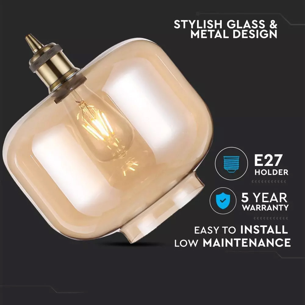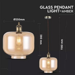 Putere Max 60 W Tensiune/ Frecventa 220-240V/AC,50-60 Hz Soclu E27 Serie Sticla si Metal Forma Bec Compatibil cu A60-67, ST-64 si Seria becurilor de tip Glob Material corp Sticla si Metal Culoare Amber Tip Pendul cu suport Dimensiuni 280*250 mm Lungimea cablului 1000 mm Compatibilitate Becuri E27, nu sunt incluse